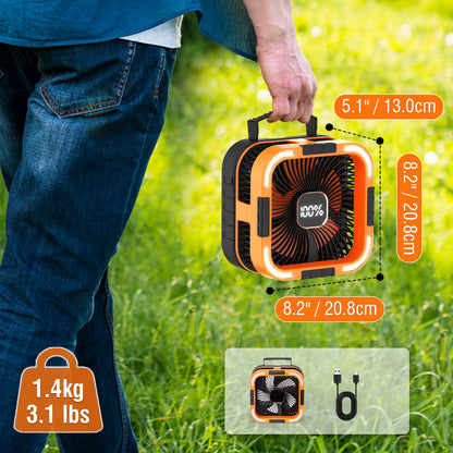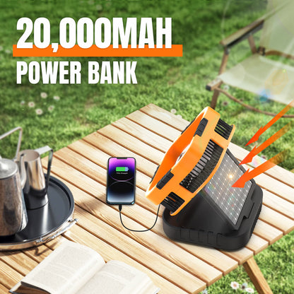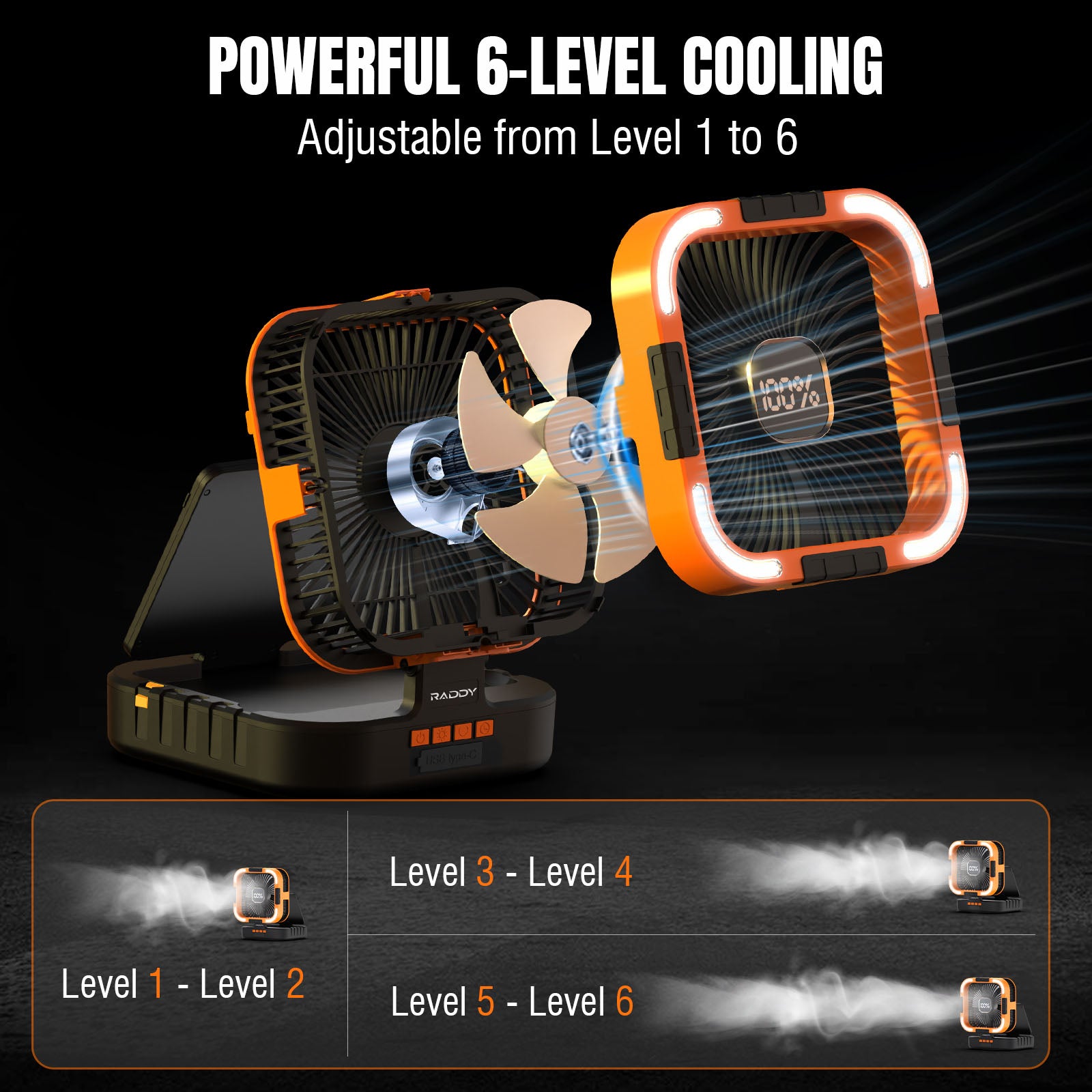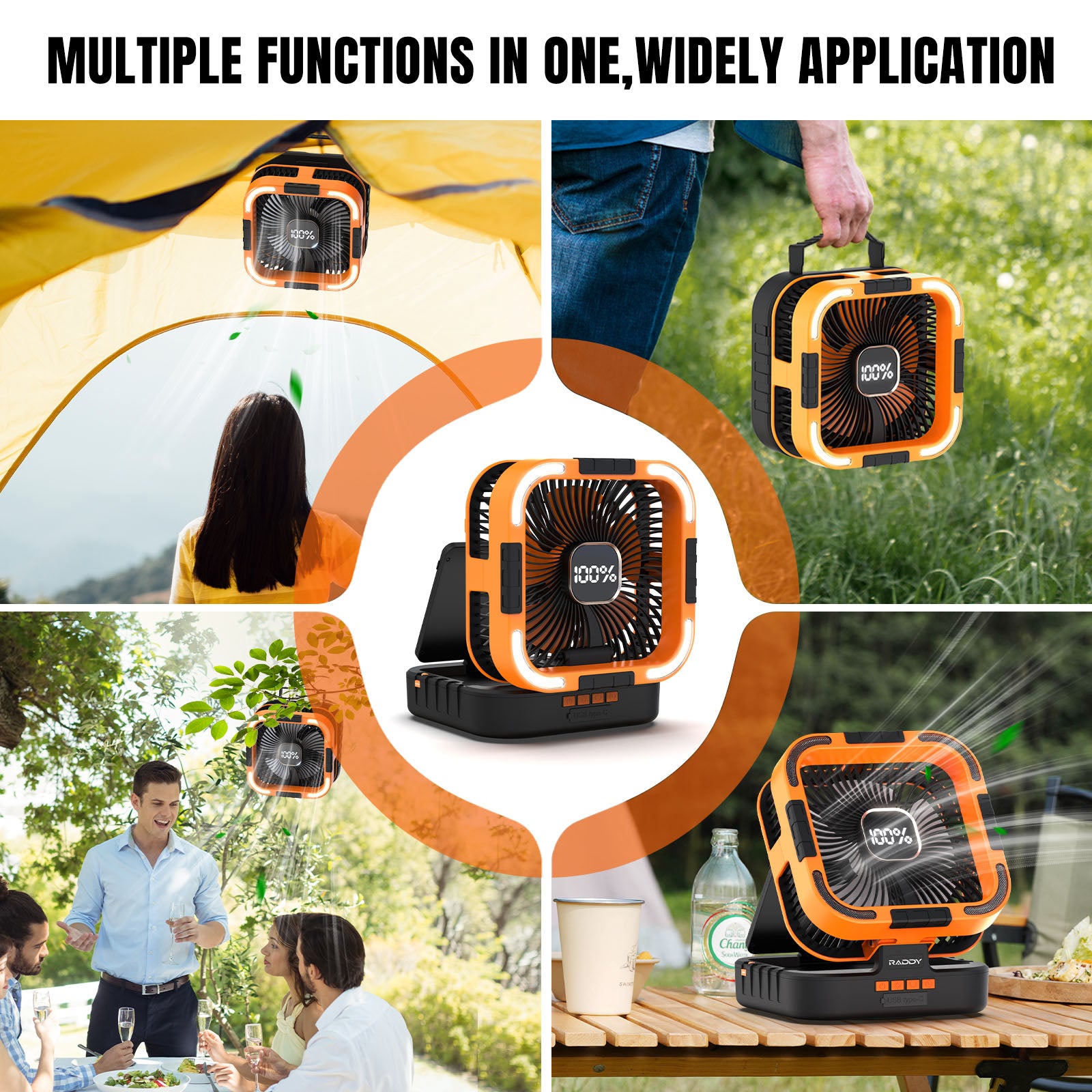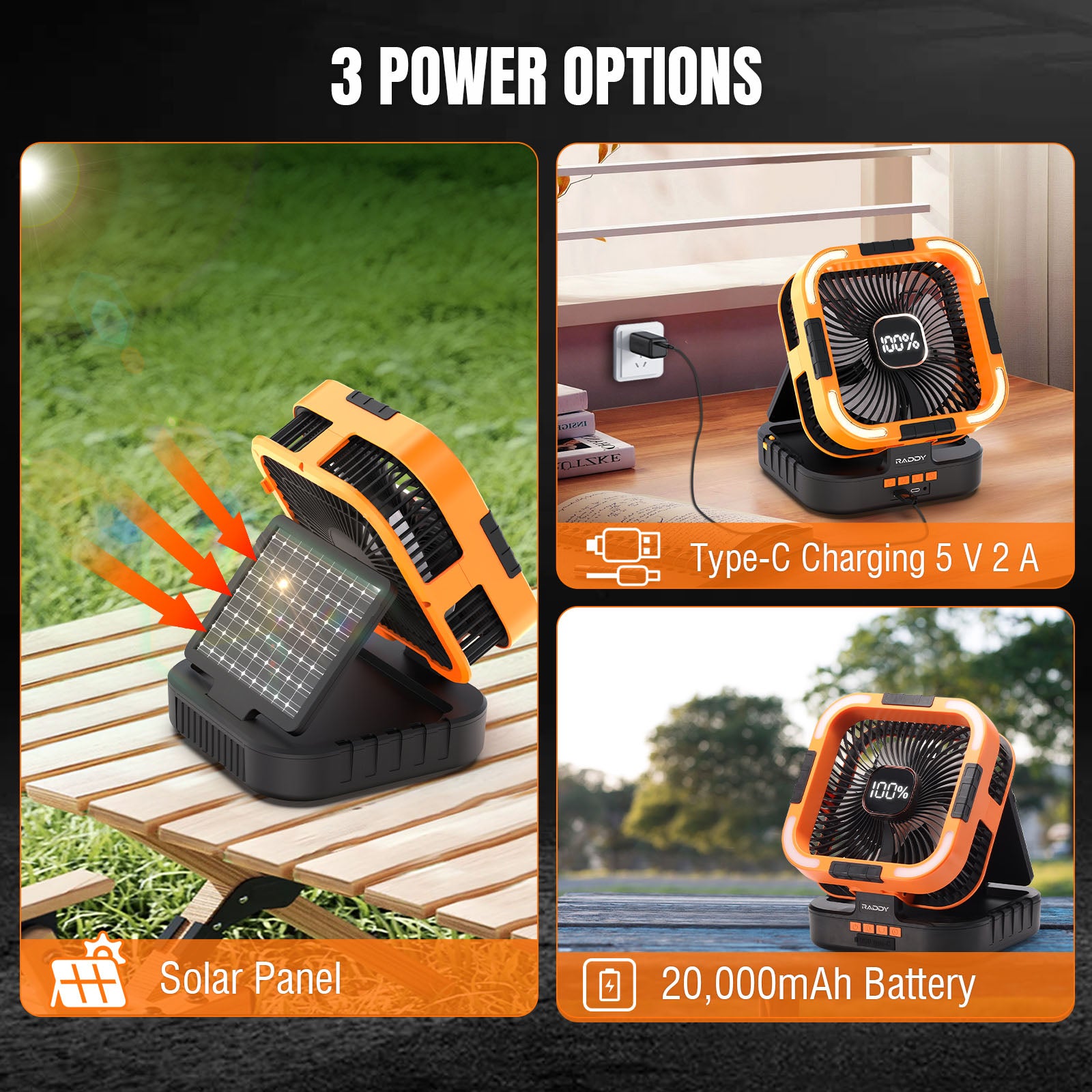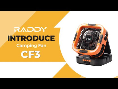 Stay cool and prepared with the upgraded Raddy CF3 solar camping fan. Powered by a 3W solar panel, 20,000mAh built-in battery, or USB-C, it offers 6 fan speeds with oscillation, plus 3 adjustable light colors and brightness settings. Use it as a portable power bank to charge your devices. Compact and versatile—hang it in your tent, carry it by hand, or set it on any surface. Ideal for camping, hiking, power outages, and emergency use.