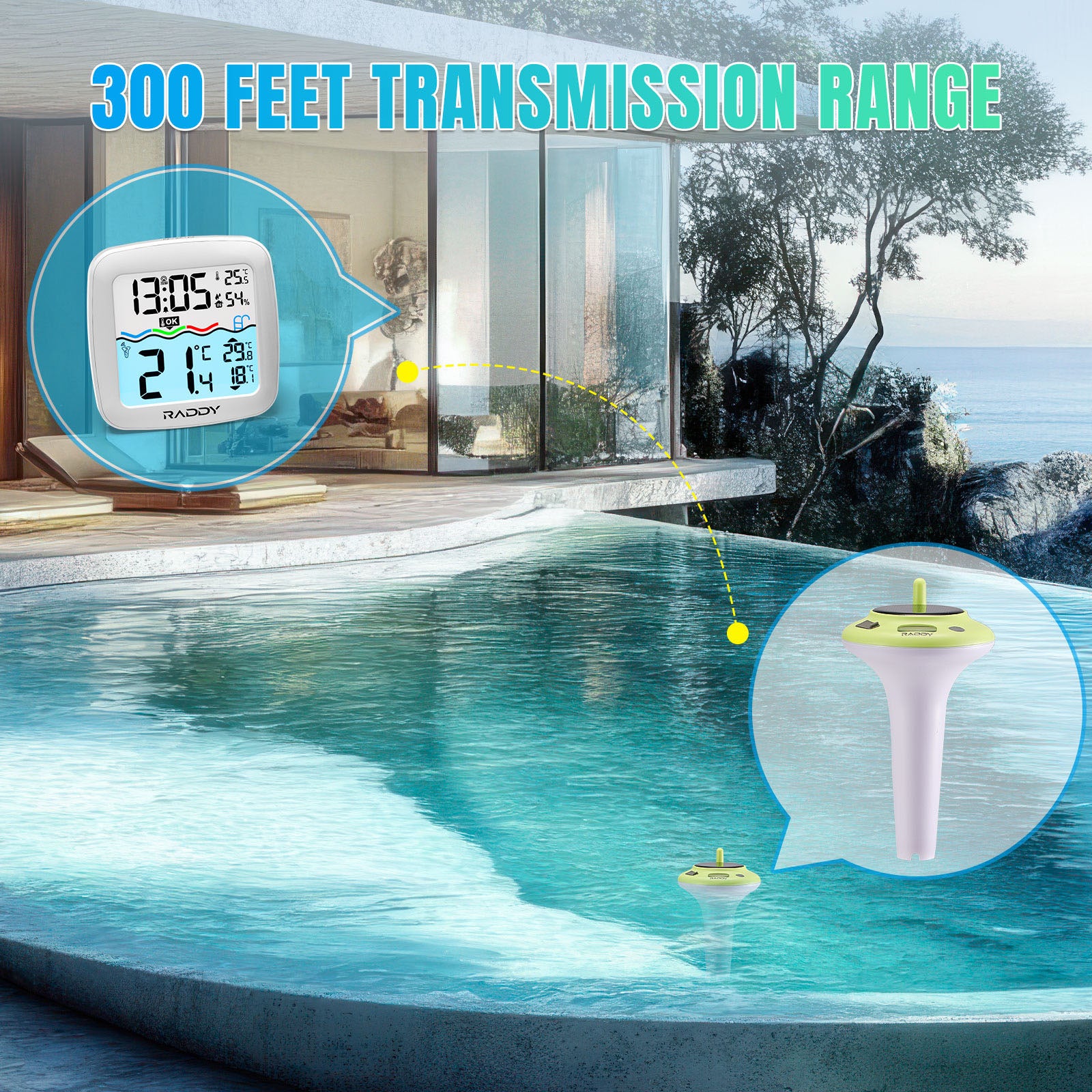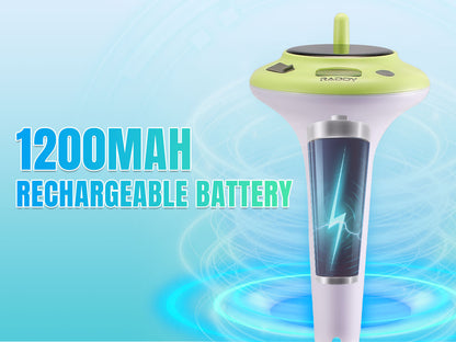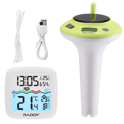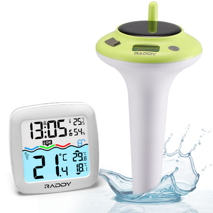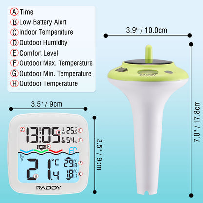 Stay on top of water conditions with the Raddy PT-5/PT-5 TN Wireless Pool Thermometer. The indoor display provides real-time updates on water temperature, daily highs/lows, and indoor temp and humidity. Switch between °C/°F, set alarms, and check comfort levels with ease. Built for long-term use, it features IPX8 waterproofing, a 1200mAh rechargeable battery, and dual solar & USB-C charging. Perfect for pools, spas, hot tubs, aquariums, ponds, and ice baths.