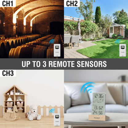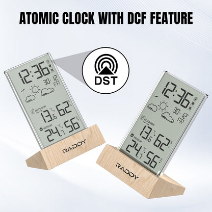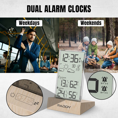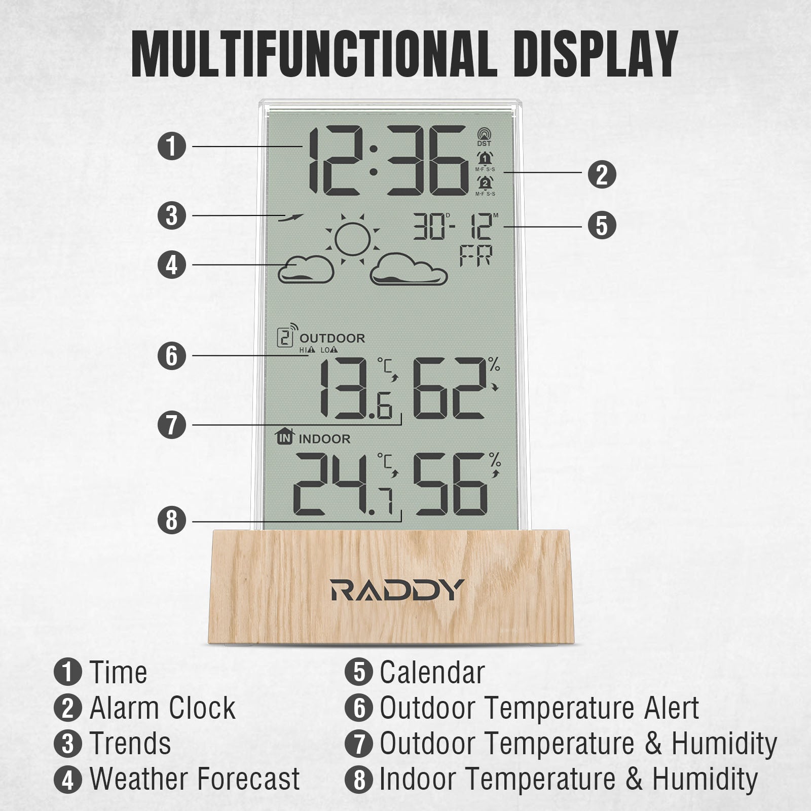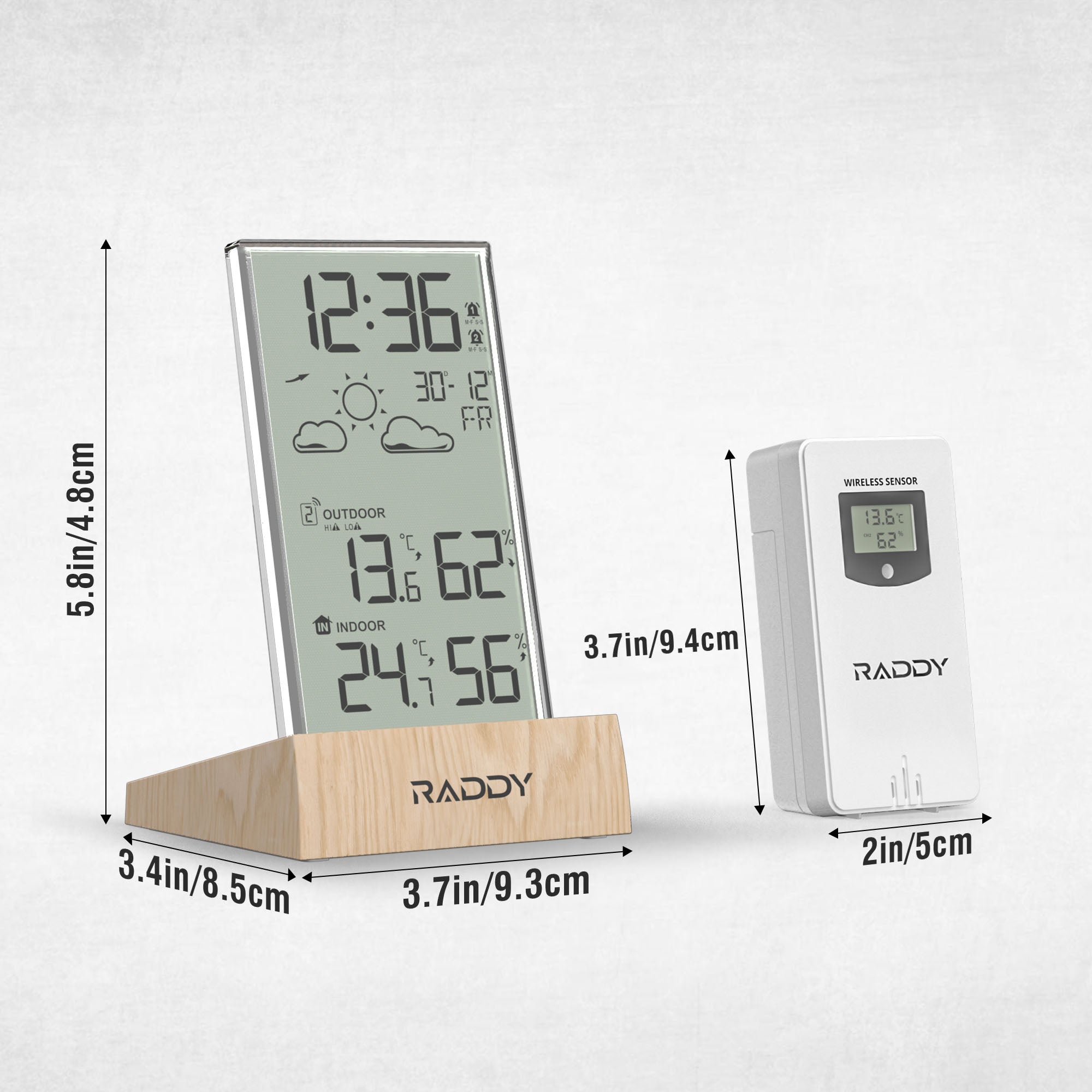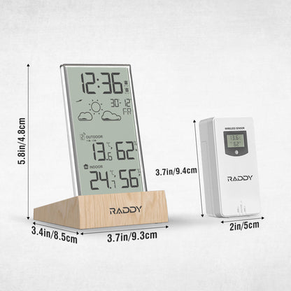 Upgrade your home environment monitoring with the Raddy V5 indoor outdoor thermometer wireless Weather Station, featuring a modern transparent acrylic frame and a natural wood grain base that blend seamlessly with any style. The clear 5.0" LCD screen displays real-time indoor and outdoor temperature and humidity readings, along with trend indicators. A built-in 12-hour weather forecast and frost alert help you stay prepared for changing conditions. With support for up to 3 remote sensors, you can easily monitor multiple areas—perfect for homes, nurseries, greenhouses, or wine cellars.