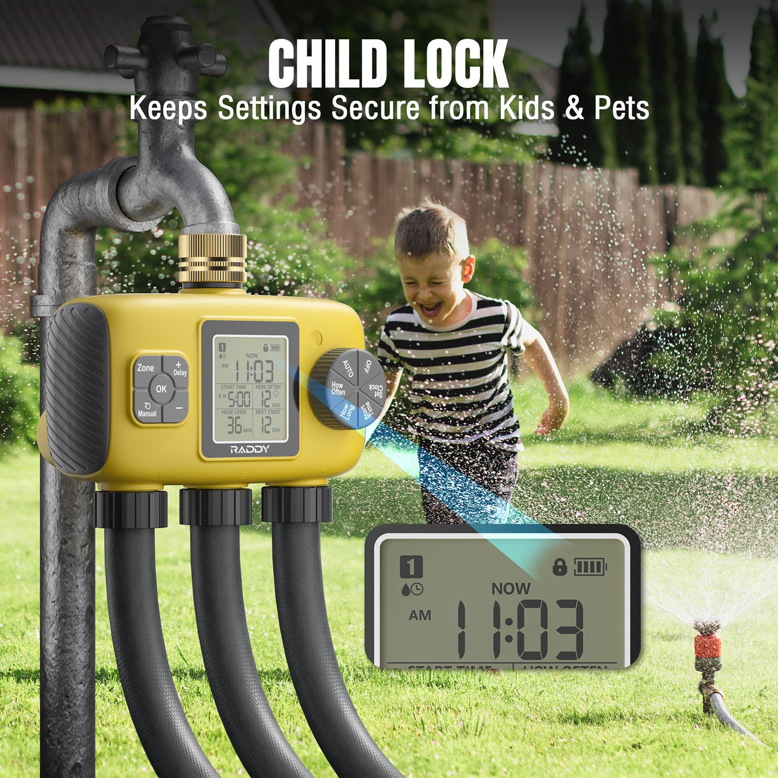 Simplify watering with the Raddy WS-8 Water Timer for Garden Hose, designed with three independent zones for precise irrigation scheduling across your garden, lawn, or yard. Customize watering durations and frequencies to suit your plant care needs, while the rain delay function helps conserve water by pausing irrigation for up to 15 days. Need instant watering? Manual mode lets you water on demand without affecting your preset schedule. Built for durability, the WS-8 features IPX5 waterproofing and a sealed battery compartment to prevent water damage. A must-have for homeowners and gardening enthusiasts, the Raddy WS-8 Water Timer brings efficiency and convenience to your irrigation system!